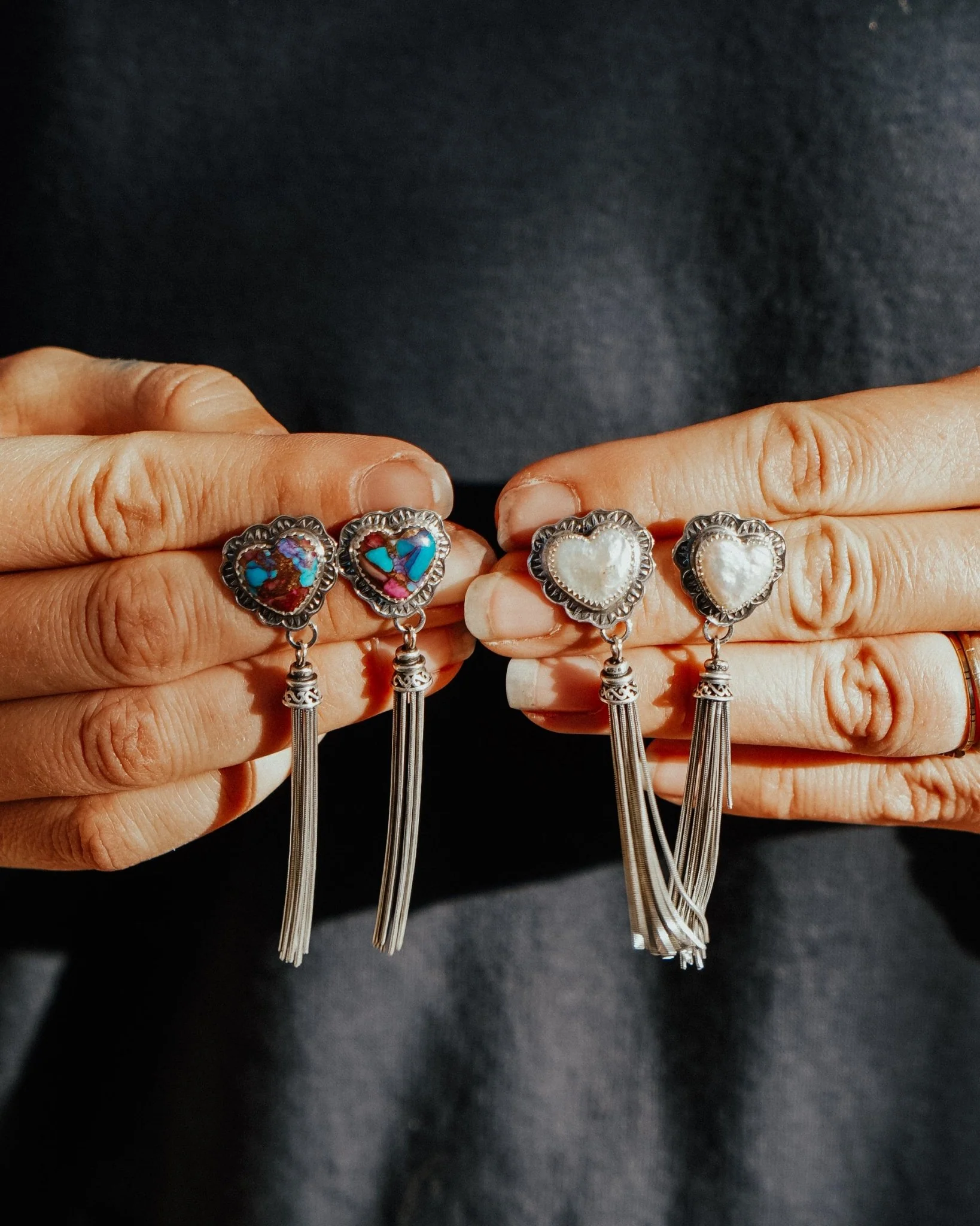 We are obsessed with this new earring design! The heart-shaped Pink Dahlia stones, the hand-stamped border, the sterling silver fringe. This is a special one!